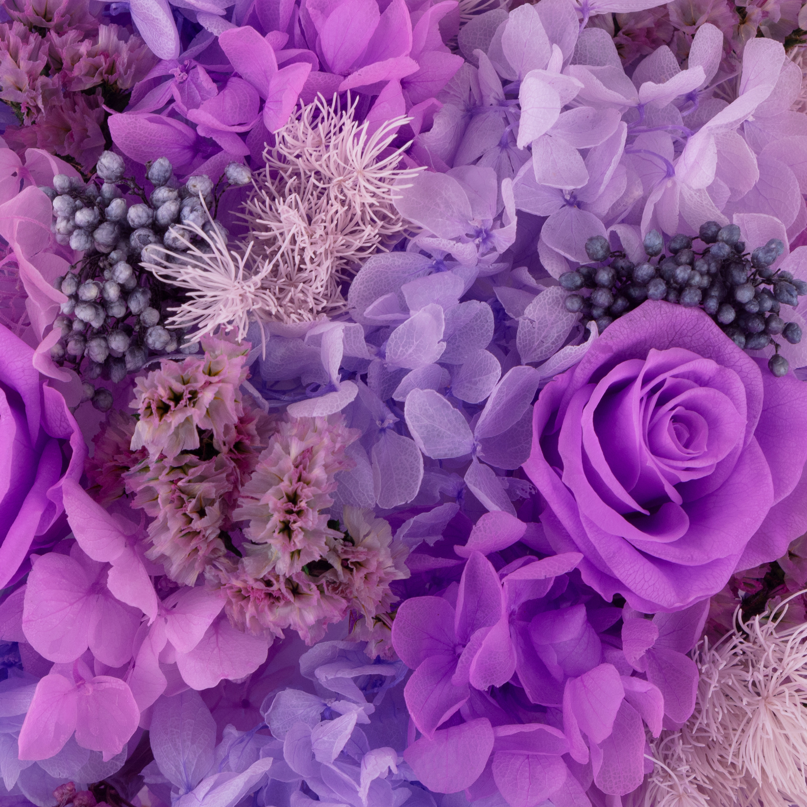 Hydrangea, Rose, Plumosus fern, Forget-me-nots, Rice flowers