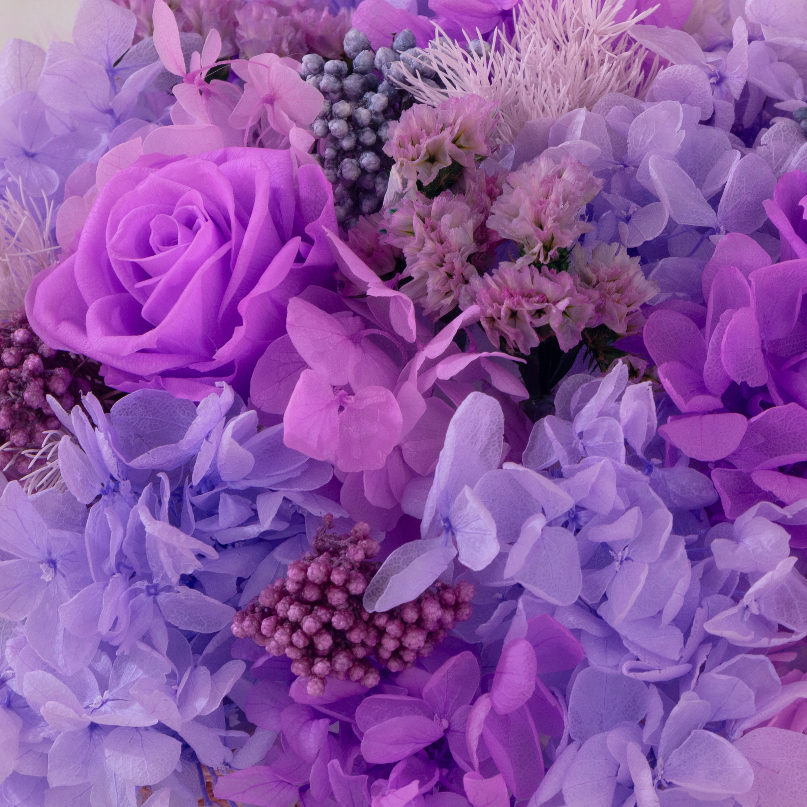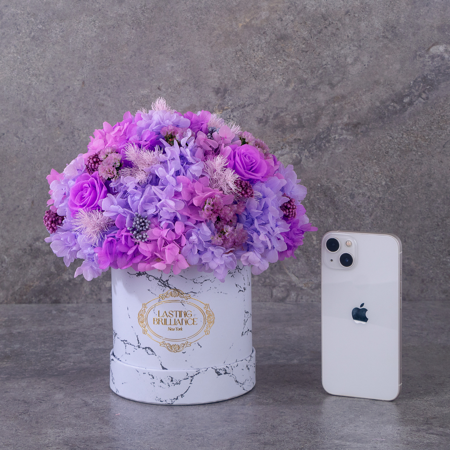Inspired by the depth and brilliance of fine jewelry, this mixed floral arrangement features preserved hydrangeas and roses in layered hues of lavender, pink, and soft violet. The palette feels rich and luminous, with natural greens adding balance and contrast.