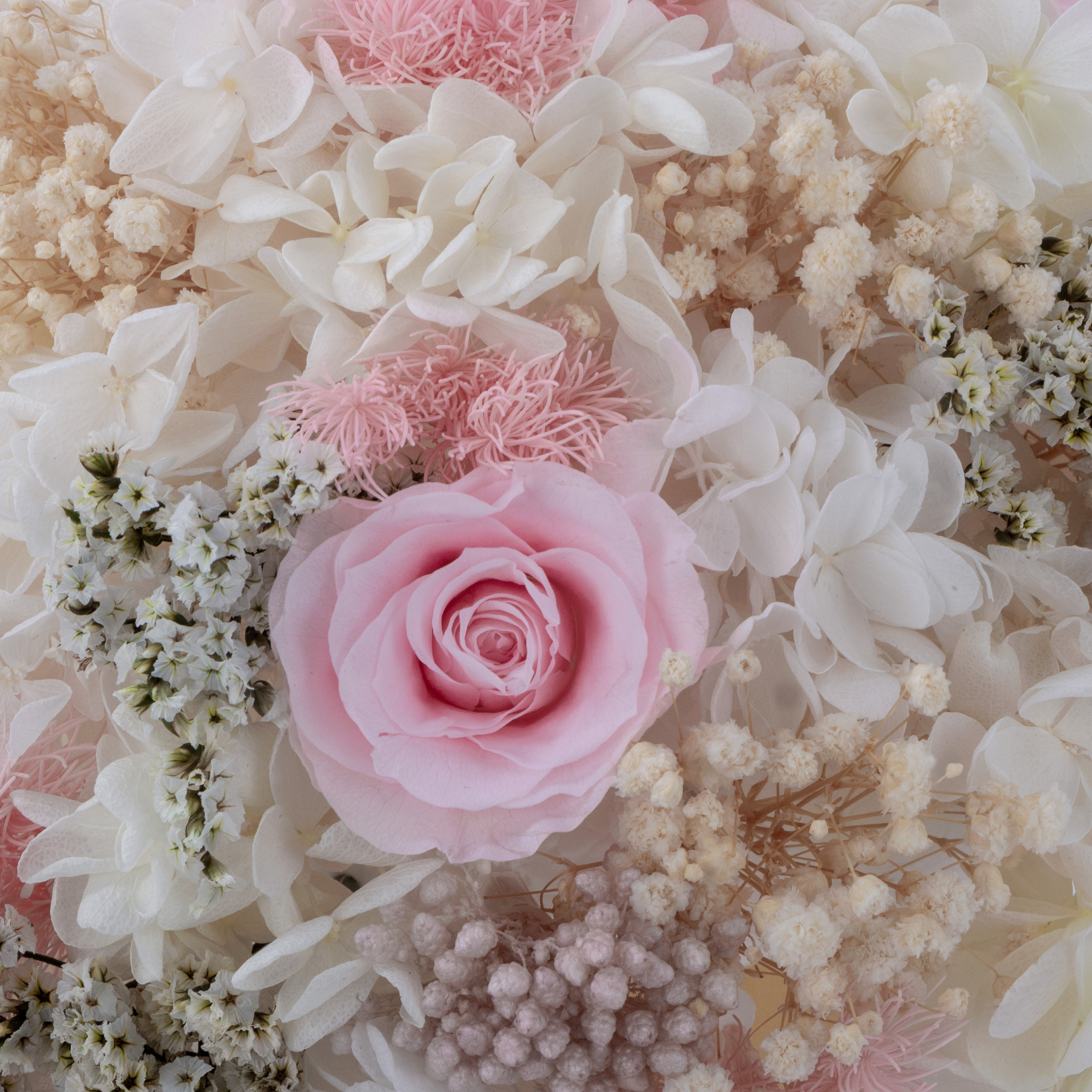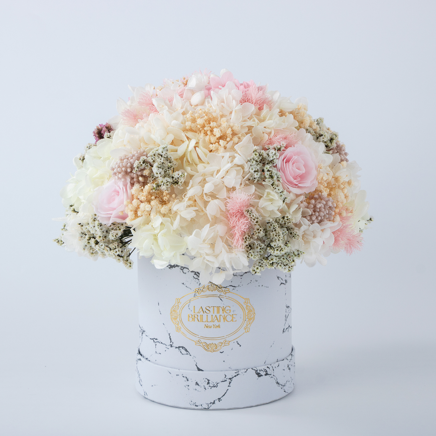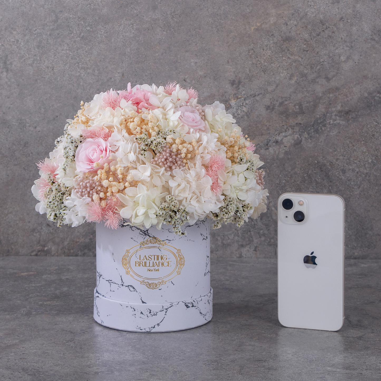 Refined, and thoughtfully composed, this mixed floral arrangement highlights preserved hydrangeas as the focal point, accented by soft pink roses and layered botanical textures. A palette of white, beige, and blush, paired with natural greens, creates a look that feels balanced, airy, and timeless.