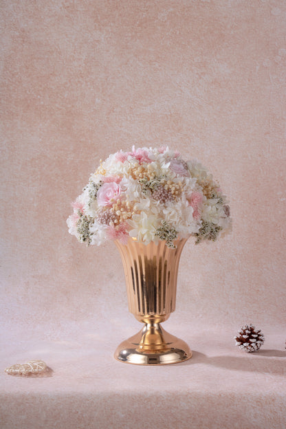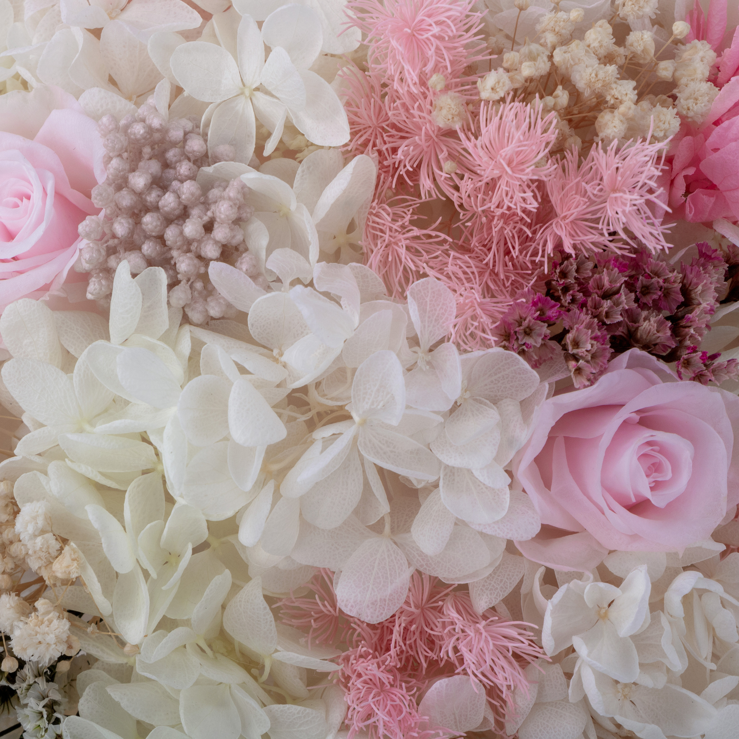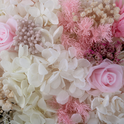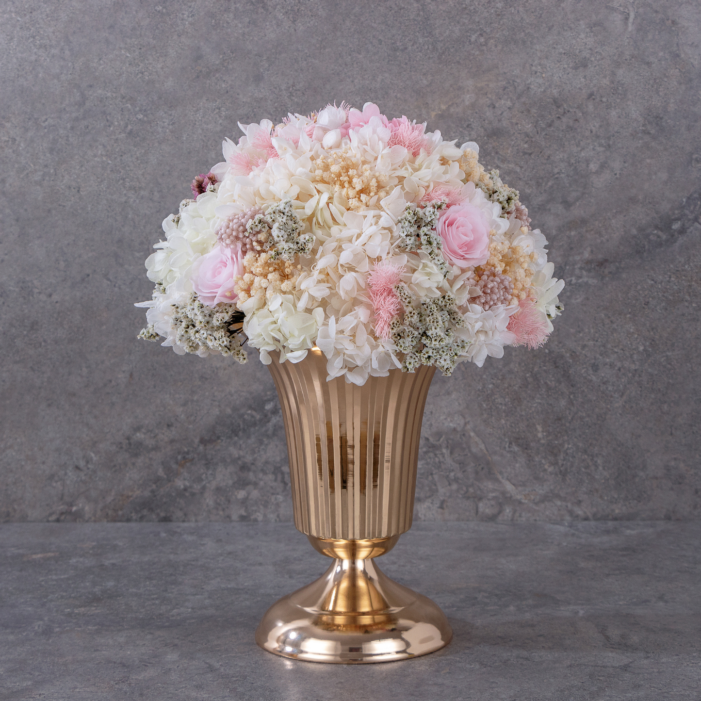 Graceful and architectural in form, this mixed floral bouquet is designed to bring height and presence to any space. Preserved hydrangeas anchor the arrangement, complemented by soft pink roses and layered botanical elements that create a refined, natural flow.