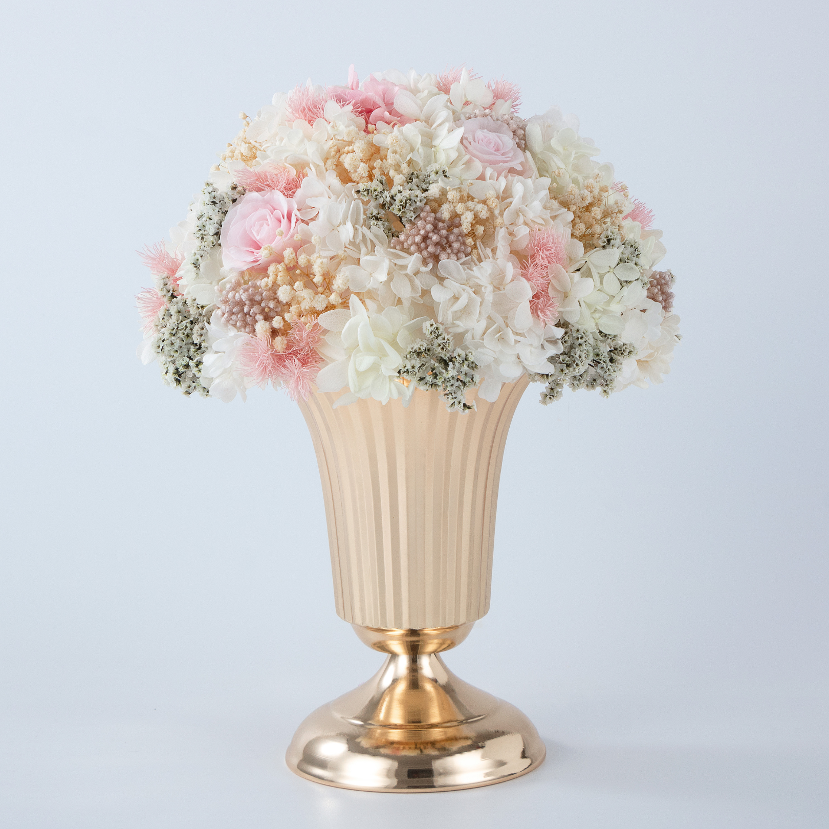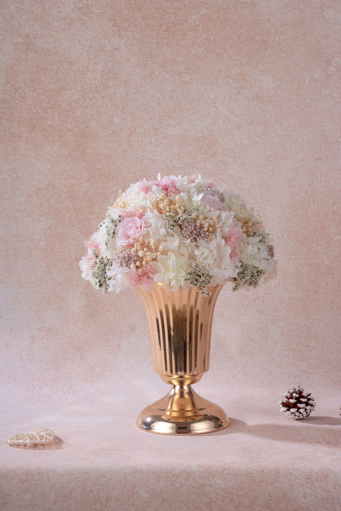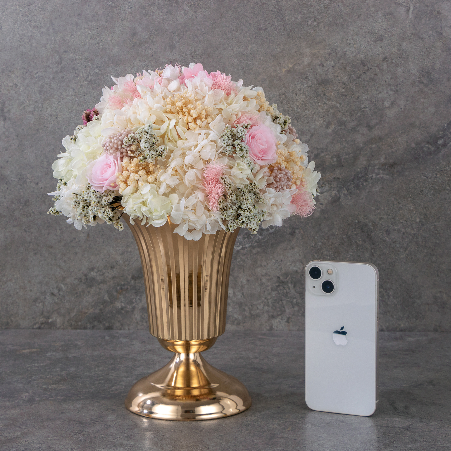 The bouquet features 50 grams of preserved hydrangea, four preserved roses, and preserved plumosus fern, accented with dried baby’s breath, dried rice flowers, and dried crystal grass for added texture. Set in a tall metal vase finished in gold, this arrangement is crafted to remain beautiful for up to 3 years with no maintenance, making it a striking choice for lasting décor or thoughtful gifting.