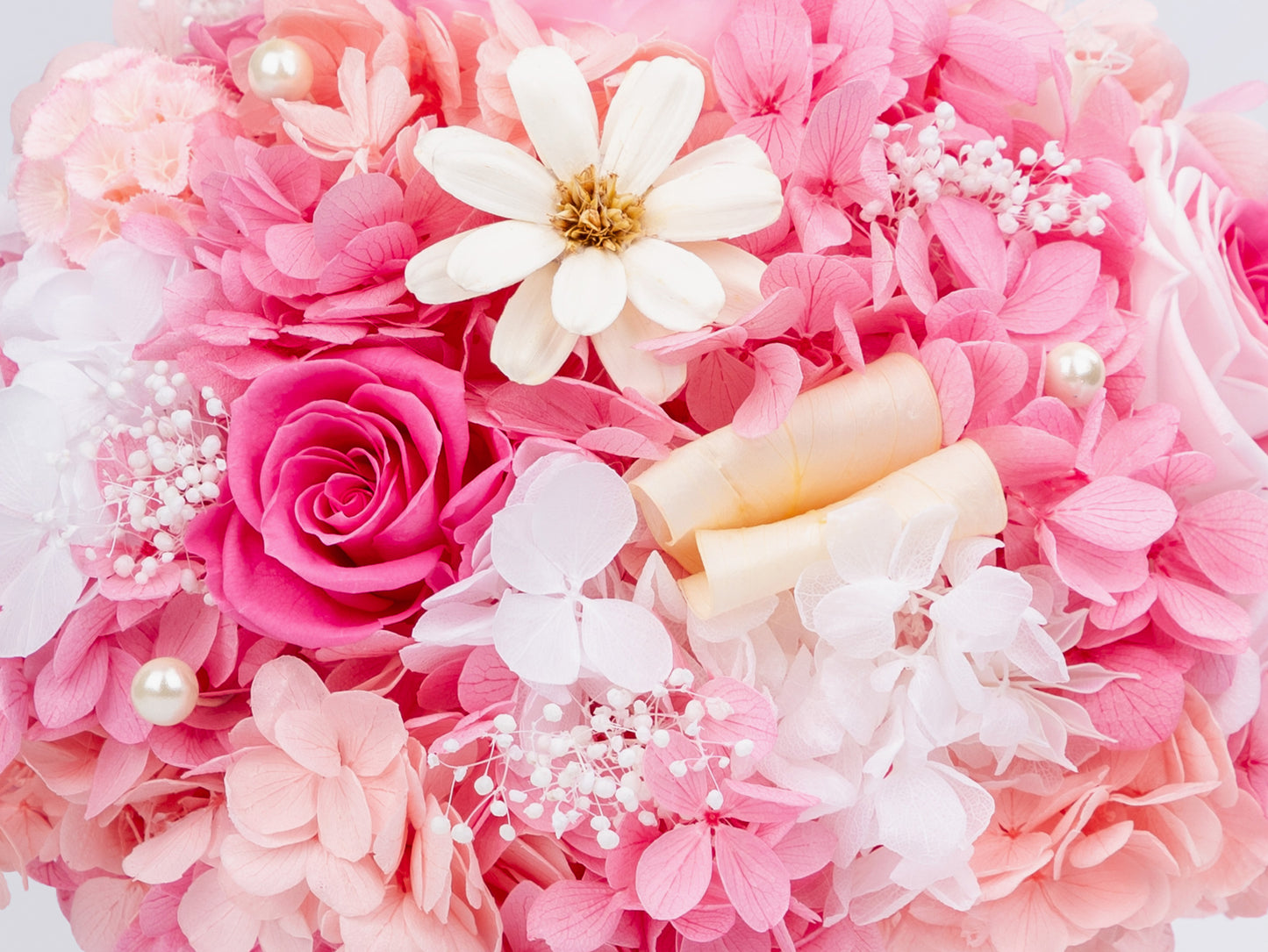 This Forever Flower Bouquet is made of real preserved flowers. It features a stunning mix of 50 Grams of Hydrangea, 4 Roses, 1 Austin Rose, 10 Baby’s Breath, 5 pieces of pearls and 1 Chrysanthemum. They come in elegant accents in soft pink, white, and light golden hues. As the only forever Hydrangea on the market, this exquisite arrangement lasts up to 3 years with no maintenance, bringing effortless luxury to any space. Perfect as a timeless gift or décor piece, it offers beauty that never fades.